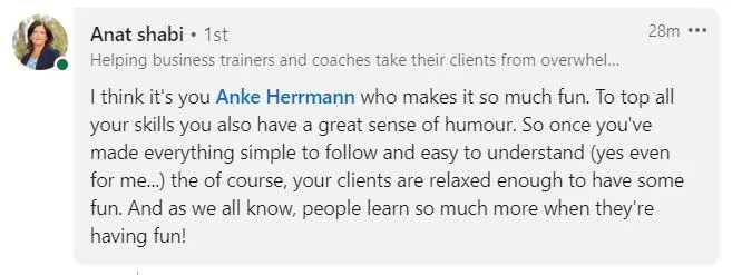 Anke is a brilliant strategic partner who helps me think through the best process to deliver my idea, what platform, what tech, who should do what and how to do it efficiently. I cannot recommend her patience, calmness and practical genius enough."